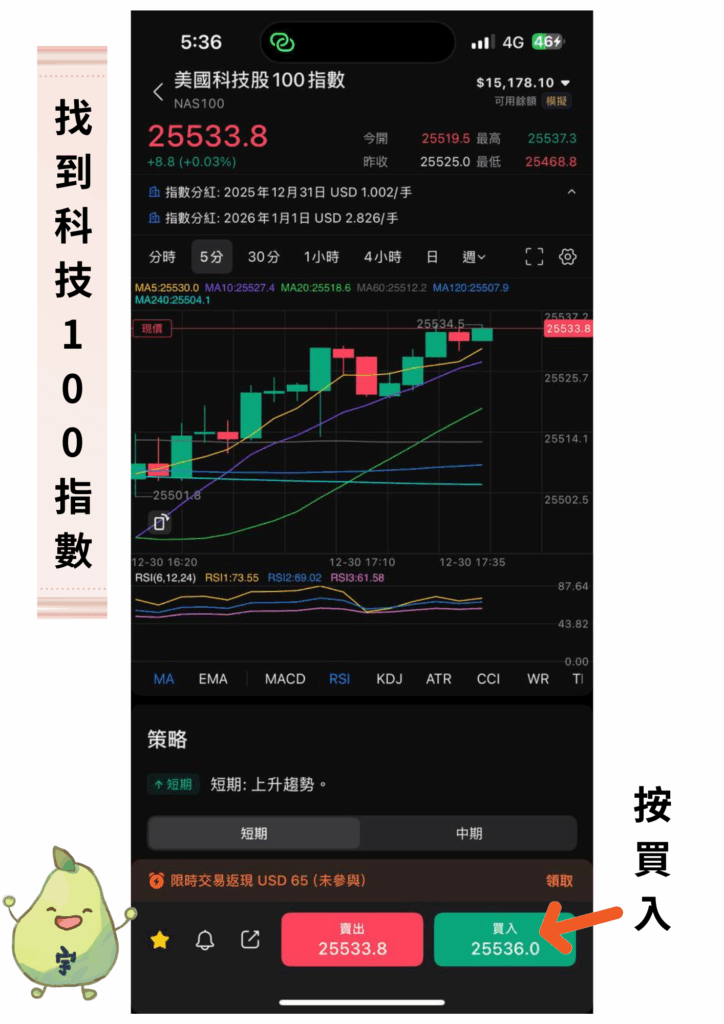 點買入後,你就成功在Mitrade買入那斯達克100指數了(美國科技100指數)!你的目的就是做價差,記得不要放太久喔~